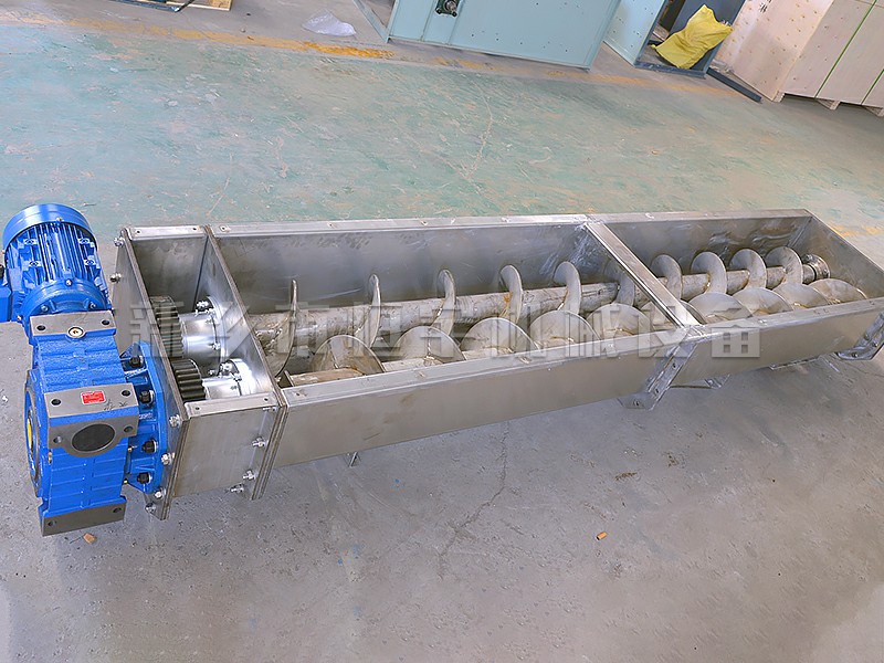 螺旋輸送機(jī)分為U型螺旋輸送機(jī)和圓管式螺旋輸送機(jī)。螺旋輸送機(jī)的機(jī)殼水平安裝時一般為U形槽,傾斜角度較大或豎直固定時一般為圓管式的;螺旋輸送機(jī)由軸和在軸上沿螺旋線布置的葉片組成。輸送干燥的、粘性小的粉、粒狀物料時用實體葉片螺旋;輸送粘性較大的或塊狀物料時用帶式葉片螺旋;輸送易結(jié)團(tuán)物料時用槳式葉片螺旋,這種螺旋除推動物料外還有打散結(jié)團(tuán)的作用。輸送距離一般在70米以內(nèi),螺旋的投影直徑在1250毫米以下。螺旋輸送機(jī)可在多處裝料、卸料,密封性好,可輸送溫度低于200℃的物料。